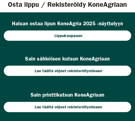 Osta lippusi ajoissa – säästät rahaa ja varmistat paikkasi messuilla! Mitä aikaisemmin ostat ennakkolipun, sitä edullisemmin pääset KoneAgriaan. Älä jää paitsi vuoden tärkeimmästä maa- ja metsätalousammattilaisen tapahtumasta!