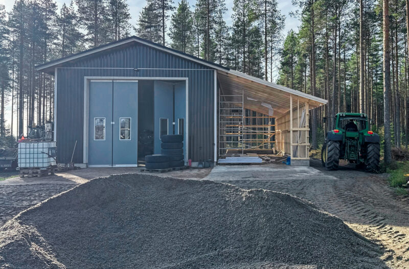 Maatalousrakentamisessa harjakorkeus on usein melkoinen ja räystäätkin korkealla. Näin ainakin rehusiiloissa ja konehalleissa. Korkean räystään alta on helppo jatkaa rakennusta lipan avulla. Tällä kertaa sellainen tehtiin lämpimän korjaamohallin kylkeen.