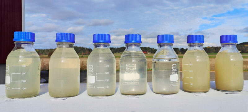 Syksyllä 2024 otettiin 21 maamonoliittia sadesimulaatiokokeisiin kahteen kertaan (0-10 cm). Lisäksi keväällä 2025 otettiin 21 monoliittia (0-20 cm). Yllä olevassa kuvassa on sadesimulaation 15.10.2024 otetut valumavesinäytteet. Vesinäytteet analysoi Lounais-Suomen vesi- ja ympäristötutkimus Oy.