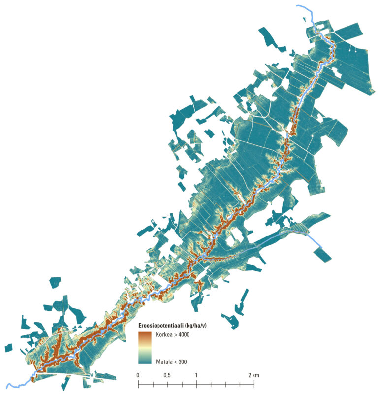 Eroosiopotentiaalin arvioinnissa huomioitiin sadanta, maalaji ja maanpinnan muodot. Kasvillisuudeksi ja maanmuokkaustoimenpiteeksi oletettiin kaikille peltolohkoille kevätvilja ja normaali syyskyntö. Näin laskettu eroosiopotentiaali kuvaa pitkän aikavälin keskimääräistä tasoa, ja mahdollistaa peltolohkojen keskinäisen vertailun.