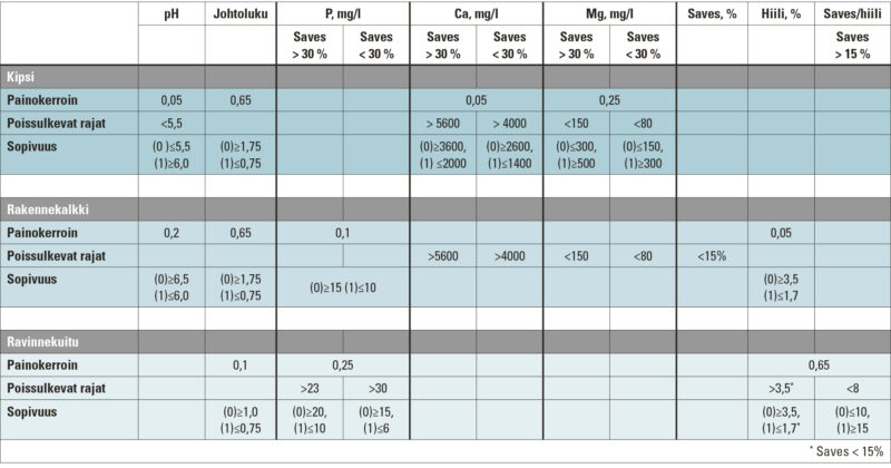 Kun jokaiselle yksittäiselle tarkastellulle ominaisuudelle oli määritetty sopivuusluku, laskettiin kokonaissopivuus näiden lukujen painotettuna keskiarvona käyttäen yllä olevassa taulukossa esitettyjä painokertoimia. Kunkin aineen kohdalla määräävin tekijä sai painoarvon 0,65 ja muut kahdesta kolmeen sopivuutta tukevaa tekijää arvotettiin pienemmillä painokertoimilla. Mitä lähemmäksi ykköstä sopivuusluku asettuu, sitä paremmin aine sopii kyseiselle pellolle. Vastaavasti sopivuusluvun lähestyessä nollaa aineen sopivuus pellolle huononee.