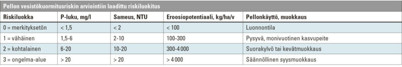 Arvio peltolohkon vesistökuormitusriskistä muodostettiin pellon viljavuusuuttoisen fosforin pitoisuudesta (P-luku), maamurujen kestävyydestä, lohkon eroosiopotentiaalista ja pellonkäytöstä (ks taulukko alla).