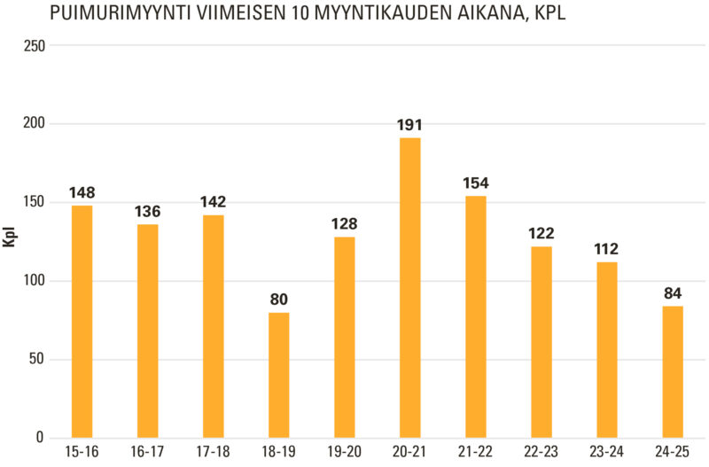 Puimurikaupan myyntimäärä jäi mittaushistorian toiseksi alhaisemmaksi. Myyntikaudella 2024–2025 kävi kaupaksi 84 puimuria.