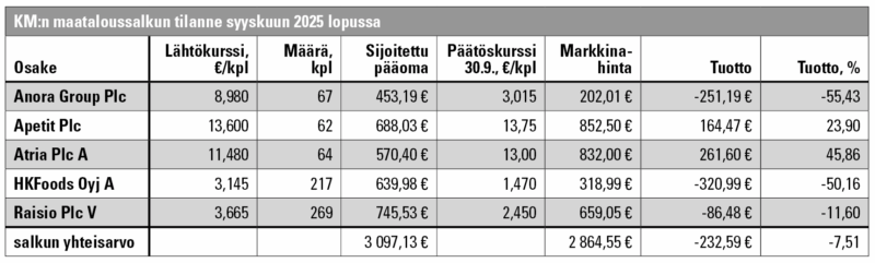 Syyskuun aikana KM-maataloussalkun osakkeiden arvo laski elokuun lopun 2.939 eurosta 2.865 euroon. Syyskuun lopulla salkkumme olikin osakkeiden arvon osalta reilu 230 euroa tappiolla.